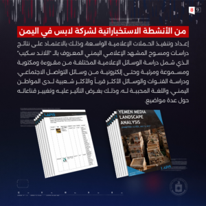ويواصل: “الدراسات التي قمنا بها في شركة لابس تركزت بشكل أساسي على جمع المعلومات عن ميول المواطن اليمني وتوجهاته والتحديات التي بتواجهه، وعن الوسائل التي يحب أن يتم مخاطبته من خلالها، وهذه المعلومات بشكل أساسي كانت ترسل وتشارك مع جهات مثل وزارة الدفاع الأمريكية، و مثل المخابرات الأمريكية، بالإضافة إلى أنها كانت معلومات يمكن أن يتم استغلالها، والاستفادة منها سواء لأغراض عسكرية أو أمنية أو سياسية أو اقتصاديه أو في أي شيء”.