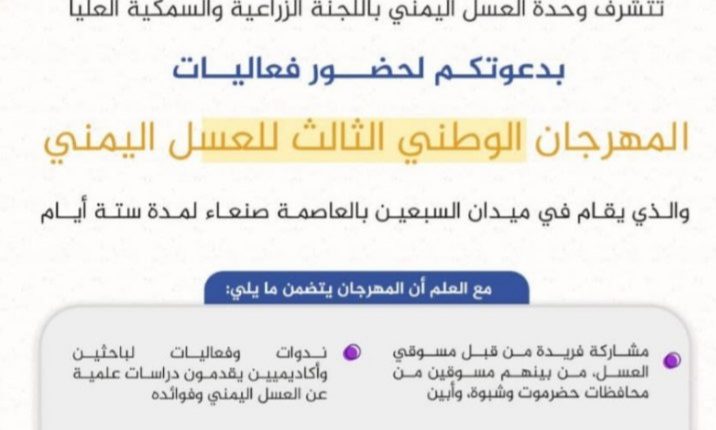 تنطلق، الأحد المقبل، فعاليات المهرجان الوطني للعسل اليمني ومنتجات النحل “الموسم الثالث” في حديقة السبعين بأمانة العاصمة تحت شعار “اليمن موطن العسل”.