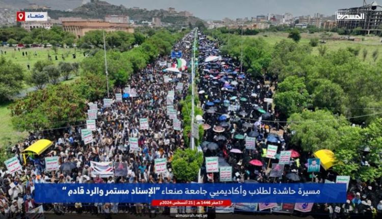 شهدت جامعة صنعاء اليوم الأربعاء، مسيرة طلابية وأكاديمية حاشدة تضامناً مع الشعب الفلسطيني تحت شعار” نصرة للأقصى وغزة، الإسناد مستمر والرد قادم”.
