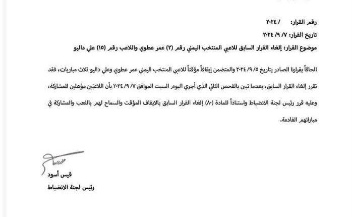 أفق نيوز | اعترفت لجنة الانضباط باتحاد بطولة غرب آسيا بخطئها بحق المنتخب اليمني للناشئين واعلنت عن تراجعها عن قرار ايقاف أثنين من أبرز نجوم المنتخب اليمني.
