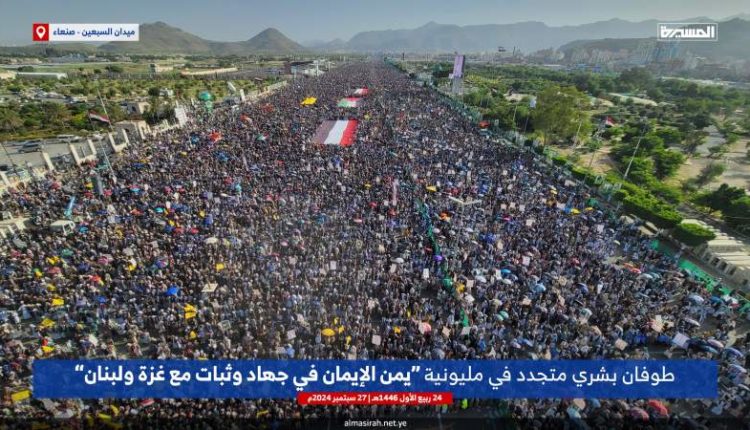 طوفان مليوني متجدد بالعاصمة صنعاء تحت شعار (يمن الإيمان في جهاد وثبات مع غزة ولبنان)