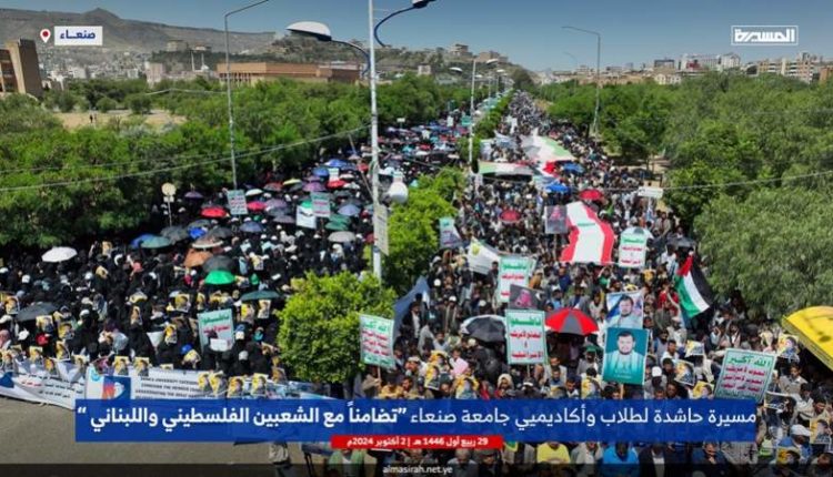 مسيرة حاشدة بجامعة صنعاء تنديداً بجريمة اغتيال الشهيد القائد السيد حسن نصر الله والعدوان على الحديدة