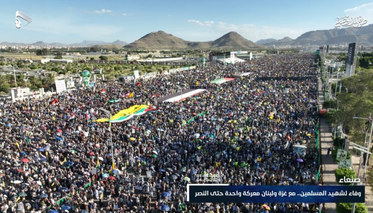وعبرت الحشود، عن الفخر والاعتزاز باستمرار العمليات العسكرية التي تنفذها القوات المسلحة اليمنية وما تحققه من انتصارات في ردع العدو الأمريكي والصهيوني والبريطاني، واستهداف السفن المرتبطة به والتي تقوم بحمايته في البحار، نصرة للشعبين الفلسطيني واللبناني ومساندة المقاومة حتى دحر العدو الإسرائيلي.