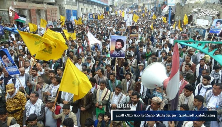 ورفعوا شعارات مؤيدة لمحور المقاومة ومؤكدة وقوف أبناء اليمن إلى جانب حماس وحزب الله والجهوزية لخوض المعركة انتصاراً للشعبين الفلسطيني واللبناني.