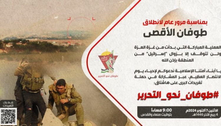 ودعا المنظمون إلى المشاركة في الحملة التي تأتي بمناسبة مرور عام لانطلاق “طوفان الأقصى” العملية المباركة التي بدأت من غزة العزة ولن تتوقف إلا بزوال “إسرائيل” من المنطقة بإذن الله.