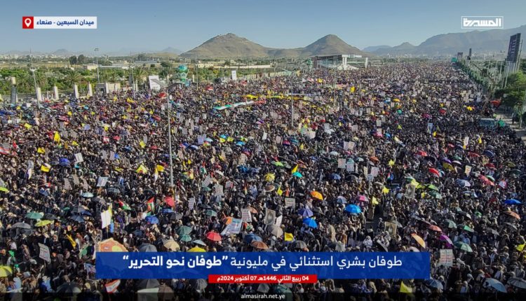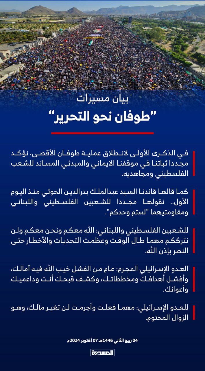 وقال الحوثي خلال مسيرة لملايين المواطنين اليوم في العاصمة صنعاء وعدد من المحافظات في الذكرى الأولى لطوفان الأقصى تحت شعار” طوفان نحو التحرير” ان الكيان الغاصب “أمريكا” غزت واحتلت كثيرا من الشعوب، فهل استطاعت أن تستمر؟ وان  أبناء فلسطين كانوا ولا زالوا في الخندق الأول، ولم يكونوا يوما خانعين أو متراجعين ولم ترهبهم القنابل الأمريكية ولا الحصار الإسرائيلي
