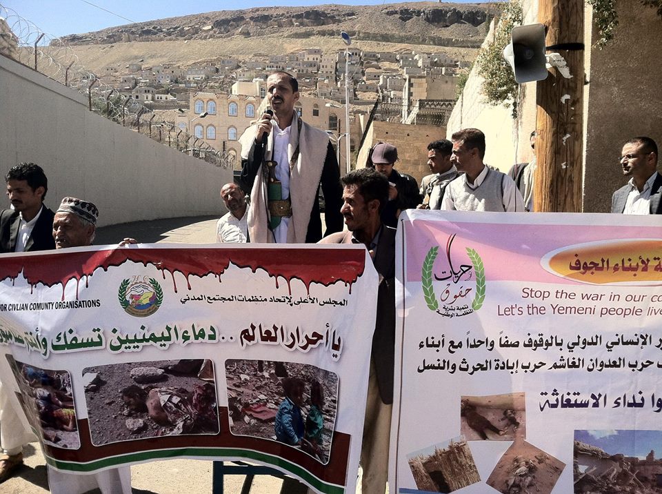 نظَّمت عددٌ من الفعاليات الاجتماعية ومنظمات المجتمع المدَني، وقفةً احتجاجيةً، صباحَ اليوم الاثنين 22 فبراير 2016، أمامَ الأمم المتحدة بالعاصمة صنعاء؛ تنديداً بدعم أَمريكا للعدوان على اليمن بقيادة النظام السعودي، والمجازر التي يرتكبها الطيران بحق اليمنيين واستهداف للمؤسسات والبنى التحتية والأحياء السكنية بمختلف الأَسلحة البيولوجية والعنقودية والمحرمة دولياً.