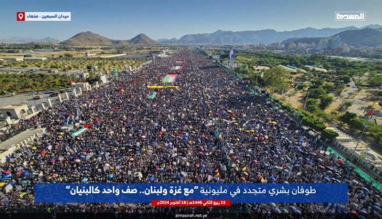 صنعاء.. حشود مليونية بميدان السبعين نصرة لفلسطين ولبنان تحت شعار (مع غزة ولبنان.. صف واحد كالبنيان)
