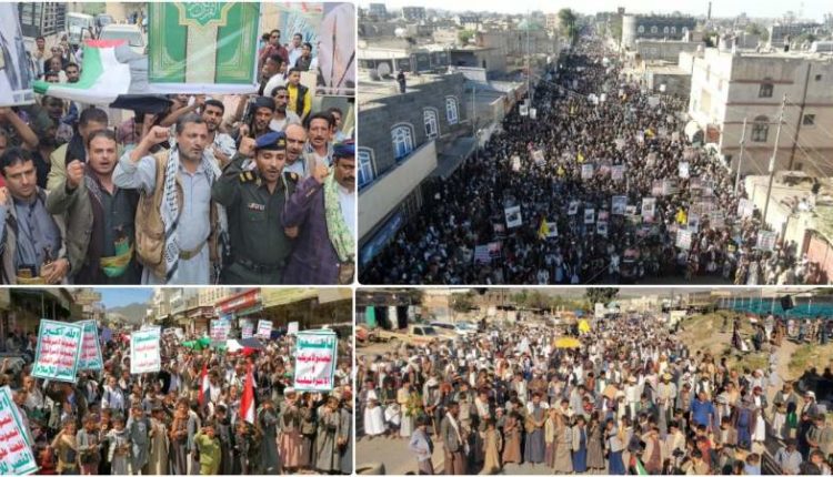 وردّد المشاركون في المسيرات التي خرجت بمديريات ذمار، وجبل الشرق، والحداء، والمنار، ومغرب عنس، وضوران، وعنس، ووصابين العالي والسافل، وعتمة، الهتافات المُعبّرة عن التضامن الكامل مع الشعبين الفلسطيني واللبناني.