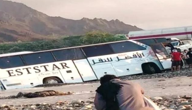 سيول الأمطار تجرف باص نقل جماعي في المكلا