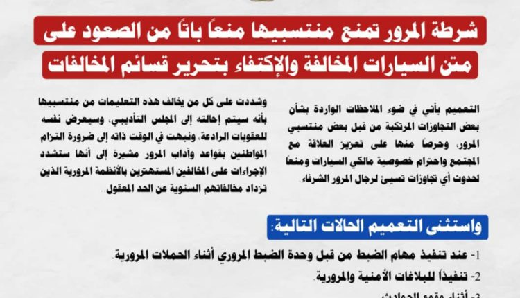 وأكدت بأنه يمنع منعاً باتاً صعود أفراد المرور على متن السيارات المخالفة أو إيصالها إلى مراكز الحجز، والإكتفاء بتحرير قسائم المخالفات المرورية.