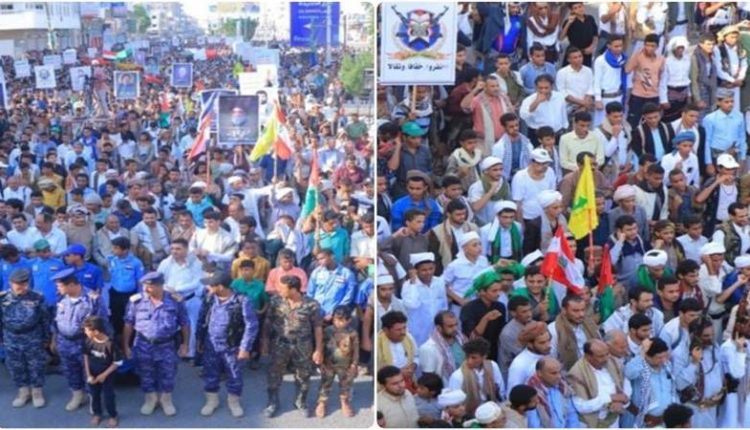 كما رددوا الشعارات المعبرة عن استمرار موقف اليمن الداعم والمساند للشعب الفلسطيني ومقاومته البطلة مهما كانت التضحيات والتحديات، مؤكدين جهوزيتهم للتصدي لأي مخططات وخوض المواجهة المباشرة مع العدو الأمريكي والصهيوني وقوى العمالة والارتزاق التي تحاول النيل من صمود وتلاحم الجبهة الداخلية.
