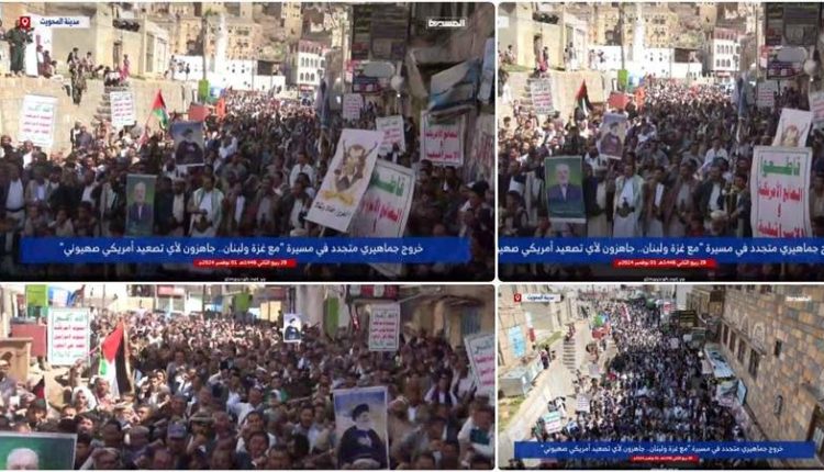 ورفع المشاركون في المسيرات الأعلام اليمنية والفلسطينية واللبنانية، ورددوا الهتافات المتضامنة مع الشعبين الفلسطيني واللبناني والمؤيدة والمساندة للمقاومة الفلسطينية واللبنانية الباسلة.