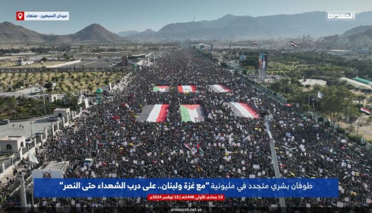 طوفان مليوني جديد بصنعاء إسنادا لفلسطين ولبنان تحت شعار (مع غزة ولبنان.. على درب الشهداء حتى النصر)
