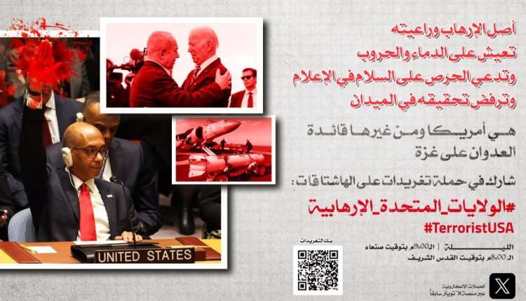 انطلقت في الساعة التاسعة من مساء اليوم، حملة تغريدات على موقع التواصل الاجتماعي “إكس” بعنوان “الولايات المتحدة الإرهابية”.