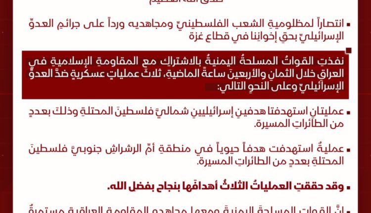 بيان القوات المسلحة اليمنية بشأن تنفيذ ثلاث عمليات عسكرية بالاشتراك مع المقاومة الإسلامية في العراق Last updated ديسمبر 3, 2024 286 Share انفوجرافيك| 286 Share FacebookTwitterGoogle+ReddItWhatsAppPinterestEmail