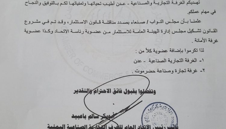 تلقت العاصمة صنعاء طلبا من غرفة تجارة عدن المحتلة تدعو لإضافة غرفتي عدن وحضرموت التجاريتين ضمن تشكيلة مجلس ادارة الهيئة العامة للاستثمار في قانون الاستثمار الجديد.