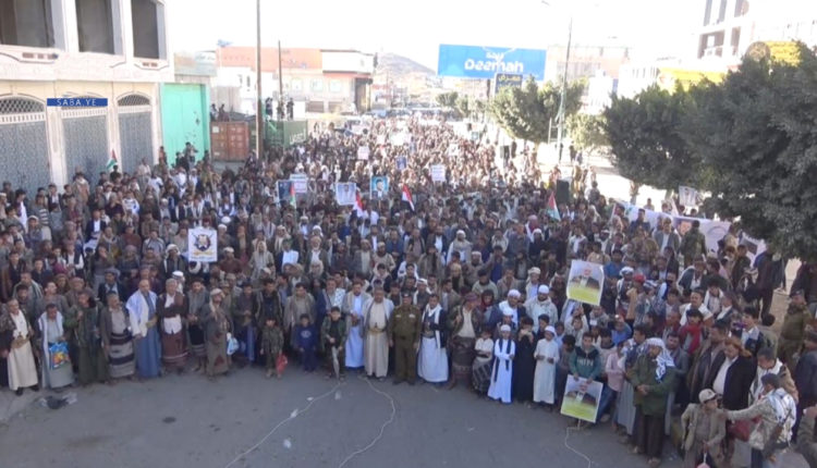 ورفعت الحشود العلمين اليمني والفلسطيني، ورددت شعارات التحدي للعدو الصهيوني والأمريكي والمؤكدة على الاستمرار في نصرة الشعب الفلسطيني مهما كانت التحديات.