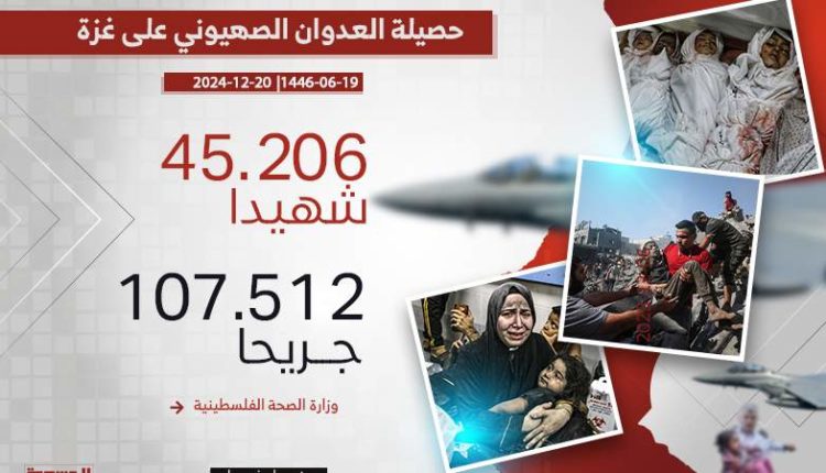 وفي تقريرها الإحصائي اليومي، أوضحت الوزارة أن العدوان الصهيوني المستمر على قطاع غزة، والذي يدخل يومه الـ441، قد رفع حصيلة الشهداء إلى 45,206، والمصابين إلى 107,512 منذ السابع من أكتوبر 2023م.