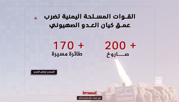 أعترف إعلام العدو الصهيوني أن القوات المسلحة اليمنية أطلقت أكثر من 200 صاروخ وأكثر من 170 مسيرة على “إسرائيل” منذ بداية دخول اليمن الحرب نصرة للشعب الفلسطيني الذي يتعرض لحرب إبادة صهيونية في غزة منذ 442 يوما.