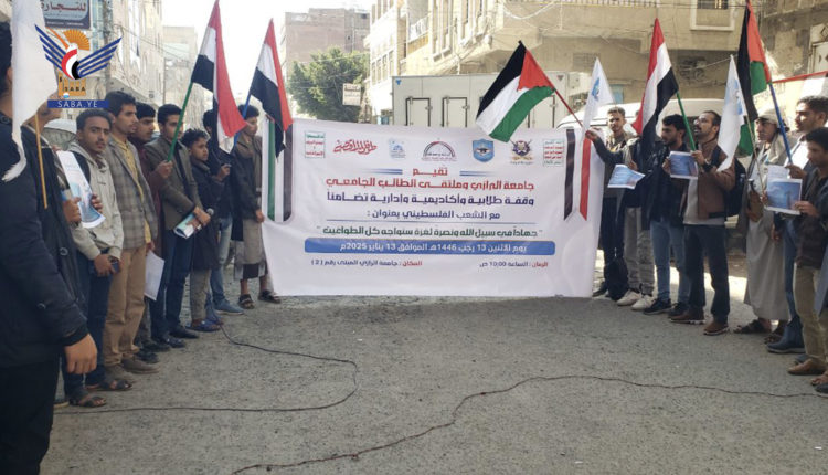 أفق نيوز| نظمت جامعة الرازي وملتقى الطالب الجامعي اليوم بصنعاء وقفة تضامنية مع الشعب الفلسطيني وتأكيدا على الجهوزية لمواجهة ثلاثي الشر أمريكا وبريطانيا وإسرائيل.