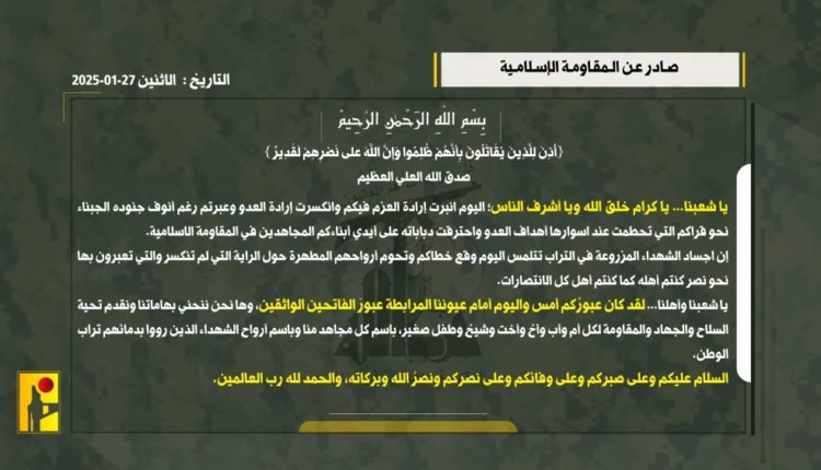 قالت المقاومة الإسلامية في لبنان في بيان لها مساء الاثنين “يا شعبنا يا كرام خلق الله ويا أشرف الناس، اليوم انبرت إرادة العزم فيكم وانكسرت إرادة العدو وعبرتم رغم أنوف جنوده الجبناء نحو قراكم التي تحطمت عند اسوارها أهداف العدو واحترقت دباباته على أيدي أبناءكم المجاهدين في المقاومة الاسلامية”.
