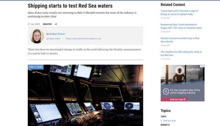 أوضحت صحيفة “لويدز لست” أن تحليلات حركة المرور عبر باب المندب وقناة السويس تشير إلى أن الإعلان اليمني في وقف العمليات البحرية فشل في إقناع قطاعات كبيرة من الصناعة بالعودة إلى المنطقة. مضيفا أن البيانات تظهر أن بعض السفن تعود إلى عبور باب المندب، لكن معظم الصناعة تواصل تجنب ذلك لم ويحدث أي تغيير ملموس في حركة المرور خلال الأسبوع الذي أعقب إعلان “الحوثيين” وقفًا جزئيًا للهجمات.
