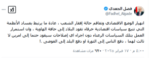 وقال عضو رئاسة الانتقالي فضل الجعدي، في منشور له على “إكس” اليوم الإثنين إن ” انهيار الوضع الاقتصادي وتفاقم حالة إفقار الشعب عادة ما يرتبط بفساد الأنظمة التي تتبع سياسات اقتصادية خرقاء تقود البلاد إلى حافة الهاوية”.