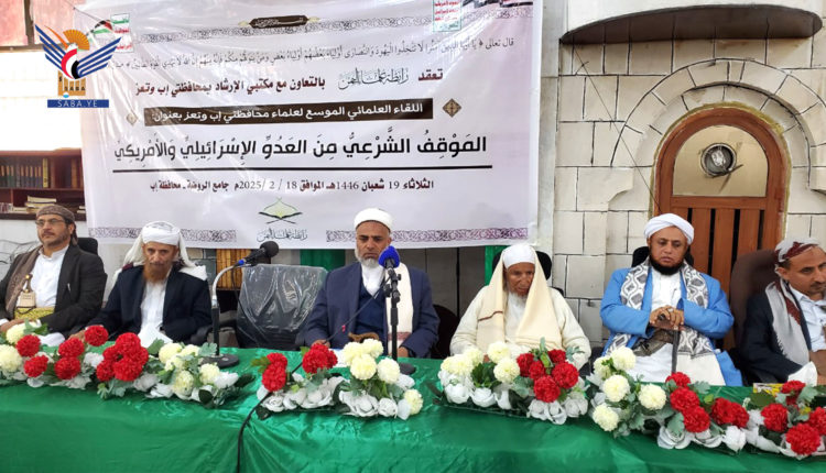 أفق نيوز | عُقد بمحافظة إب اليوم لقاء موسع لعلماء محافظتي إب وتعز، نظمته رابطة علماء اليمن تحت شعار “الموقف الشرعي من العدو الأمريكي، الإسرائيلي”.
