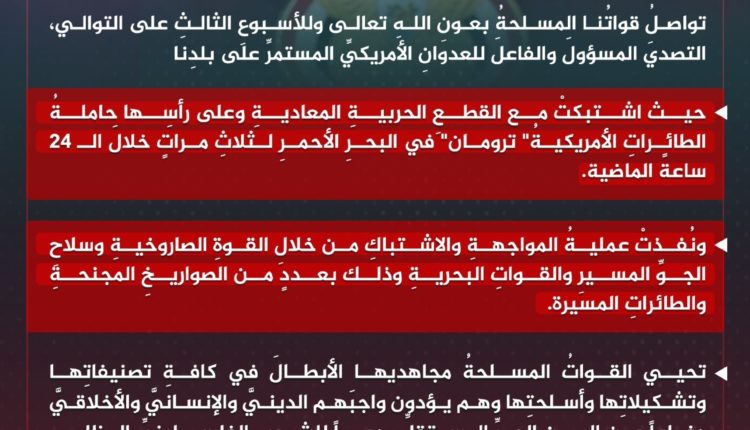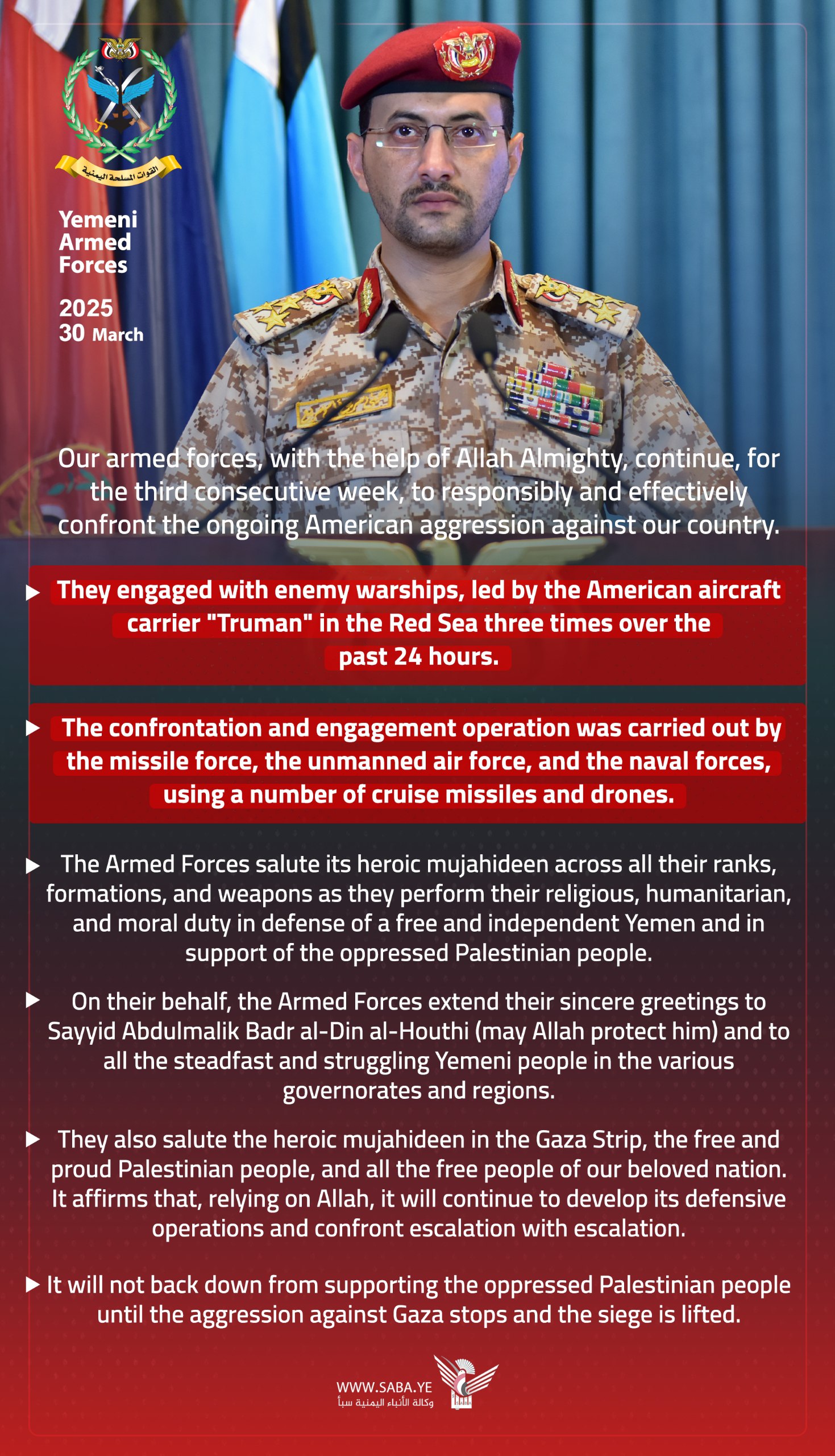 انفوجرافيك ـ بيان القوات المسلحة اليمنية بشأن استهداف حاملة الطائرات الأمريكية “ترومان” وعددا من القطع الحربية المعادية في البحر الأحمر لثلاث مرات خلال الـ 24 ساعة الماضية. On مارس 30, 2025 190 Share 190 Share FacebookTwitterGoogle+ReddItWhatsAppPinterestEmail