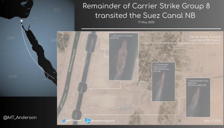 التقرير أشار إلى أن محللين استخبارات المصادر المفتوحة قالوا على موقع X إن صور الأقمار الصناعية أظهرت ترومان وجيتيسبيرغ وهما تعبران قناة السويس شمالًا باتجاه البحر الأبيض المتوسط يوم السبت. وأظهرت صور البحرية المنشورة على الإنترنت ترومان وهي تعمل في البحر الأبيض المتوسط يوم الأحد.