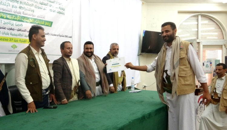 اختتمت مؤسسة بينان وأكاديمية بنيان للتدريب والتأهيل، اليوم الثلاثاء ، دورة تدريبية في بناء قدرات الهيئات الإدارية للجمعيات التعاونية الزراعية لمديريات الحداء، جهران، وصاب السافل وميفعة عنس بمحافظة ذمار وناطع، والسوادية بمحافظة البيضاء ضمن برنامج الجمعيات.