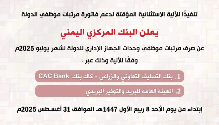 يعلن البنك المركزي اليمني عن صرف مرتبات موظفي وحدات الجهاز الإداري للدولة لشهر يوليو 2025م وفقاً للآلية وذلك عبر: