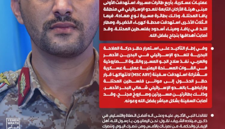 بيان القوات المسلحة اليمنية On سبتمبر 2, 2025 829 Share أفق نيوز| نفذت القوات المسلحة اليمنية عمليات نوعية استهدفت سفينة (MSC ABY) المرتبطة بالعدو الإسرائيلي، وشنّت هجمات داخل عمق الكيان الإسرائيلي في فلسطين المحتلة، مؤكدّة استمرار الرد الحازم على الاعتداءات. بيان القوات المسلحة اليمنية 829 Share FacebookTwitterGoogle+ReddItWhatsAppPinterestEmail