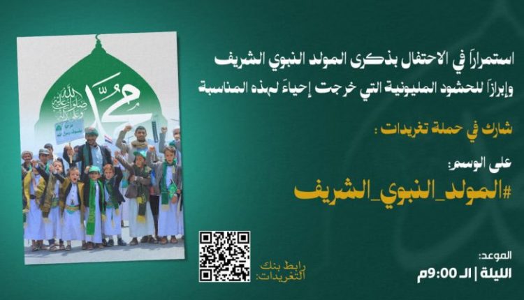تنطلق الليلة على منصة “إكس” حملة تغريدات واسعة تحت وسم #المولد_النبوي_الشريف، لتسليط الضوء على الحشود المليونية في صنعاء والمحافظات اليمنية الحرة احتفالًا بالمولد النبوي الشريف 1447هـ.