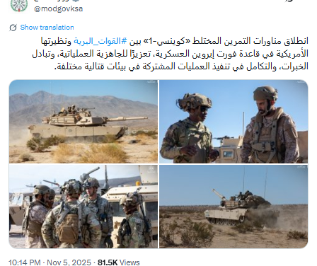 انطلقت مناورات عسكرية سعودية أمريكية، في قاعدة فورت إيروين بالولايات المتحدة. وأفادت وزارة الدفاع السعودية، في بيان، بـ”انطلاق مناورات التمرين المختلط كوينسي-1 بين القوات البرية ونظيرتها الأمريكية”.