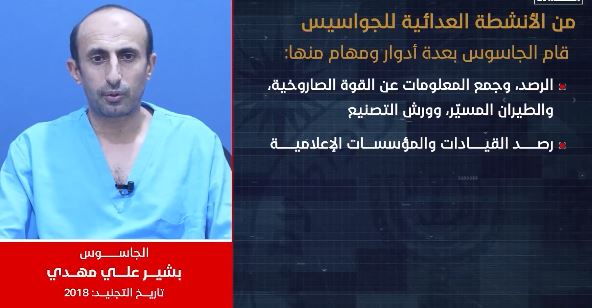 فيديو من اعترافات الجاسوس بشير علي مهدي: كشف رصد قيادات الدولة والقوة الصاروخية والمؤسسات الإعلامية تحت غطاء منظمة تنموية لصالح غرفة استخباراتية مشتركة (CIA – الموساد – السعودية)، يأتي ذلك في سياق عملية “#ومكر_أولئك_هو_يبور”. والتي كشفت تورط الجواسيس في جمع المعلومات الحساسة ونقلها للخارج .