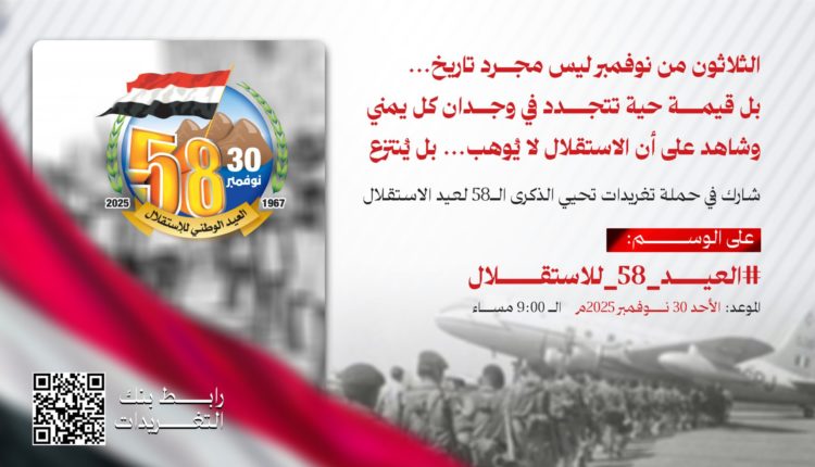ومن المقرر أن تنطلق الحملة مساء الأحد 30 نوفمبر 2025 عند الساعة التاسعة مساءً، عبر وسم: #العيد_58_للاستقلال، بهدف تسليط الضوء على قيمة هذا اليوم التاريخي وما يحمله من دلالات وطنية تعكس نضال الشعب اليمني في سبيل التحرر والسيادة.