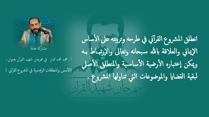 قدّم الباحث أ. محمد محمد الدار ورقة بحثية فكرية مهمة ضمن فعاليات مهرجان الشهيد القائد رضوان الله عليه، حملت عنوان ((الأسس والمنطلقات الرئيسية في المشروع القرآني))، سلطت الضوء على المرتكزات الفكرية والمنهجية التي قام عليها المشروع القرآني الذي أسسه الشهيد القائد حسين بدر الدين الحوثي رضوان الله عليه، بوصفه مشروع تغيير وإصلاح ونهضة حضارية شاملة، وأكد الباحث في مستهل ورقته أن المشاركة تأتي في مرحلة عصيبة تمر بها الأمة، ما يجعل العودة إلى المشروع القرآني ضرورة ملحّة، باعتباره مشروعًا أثبت فاعليته في بناء الوعي، واستعادة الهوية، وتعزيز القوة والمنعة، مشيرًا إلى أن الشهيد القائد مثّل نموذجًا فريدًا للقائد القرآني المجدد في الألفية الثالثة.