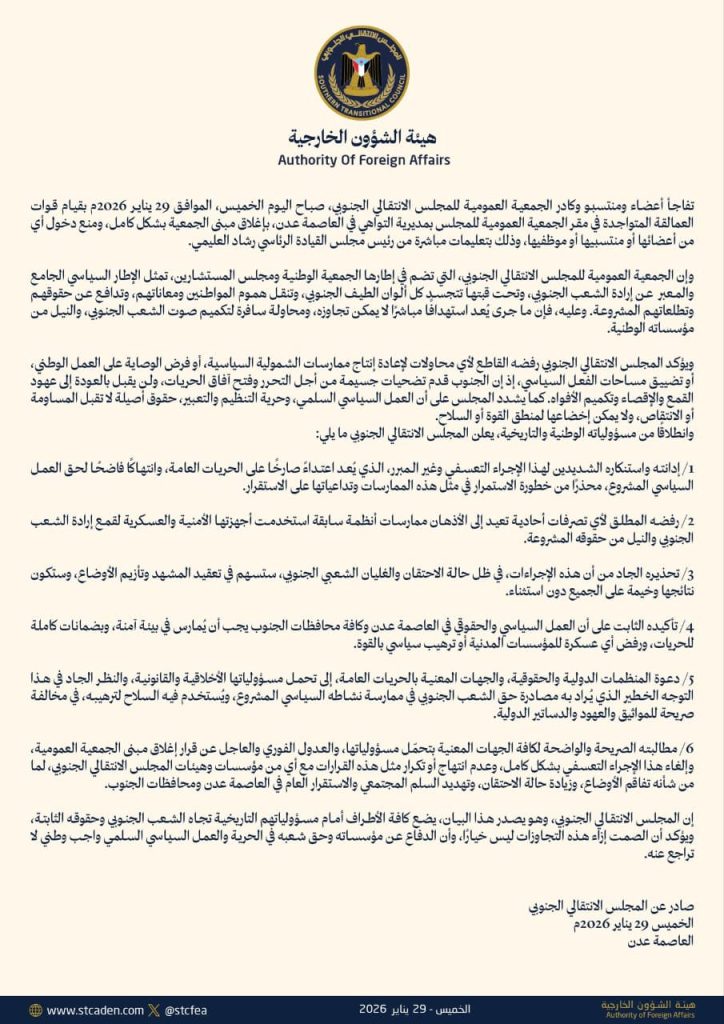 وفي رد فعل رسمي، وصفت “هيئة الشؤون الخارجية بالانتقالي” إغلاق المقر بأنه “استهداف مباشر لتكميم صوت الشعب الجنوبي والنيل من مؤسساته الوطنية”، مؤكدة رفضها لأي ممارسات شمولية أو قمع سياسي.