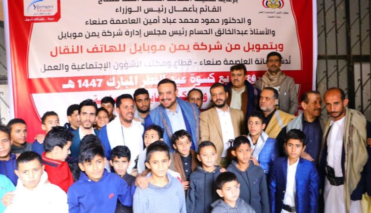 دشّن أمين العاصمة الدكتور حمود عُباد، ومعه رئيس مجلس إدارة شركة يمن موبايل للهاتف النقال الأستاذ عبدالخالق الحسام، اليوم، مشروع توزيع كسوة عيد الفطر المبارك لنزلاء دور ومراكز الرعاية الاجتماعية بأمانة العاصمة، في مبادرة إنسانية تأتي برعاية وتمويل من شركة يمن موبايل، ضمن توجهها المستمر في دعم المبادرات المجتمعية والإنسانية الهادفة إلى مساندة الفئات الأكثر احتياجًا.