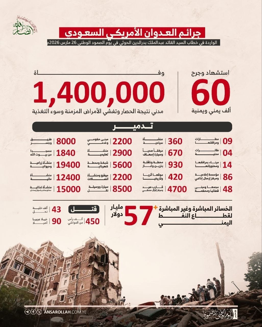 إنفوجرافيك | السيد القائد: هكذا دمر العدوان الأمريكي السعودي اليمن خلال 11 عاماً