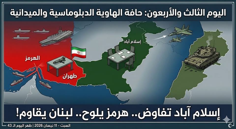 اليوم الثالث والأربعون: إسلام آباد تتحول إلى “حقل ألغام” تفاوضي.. طهران تُشرع سلاح هرمز، ولبنان يُحرق الميركافا وأوهام السلطة!