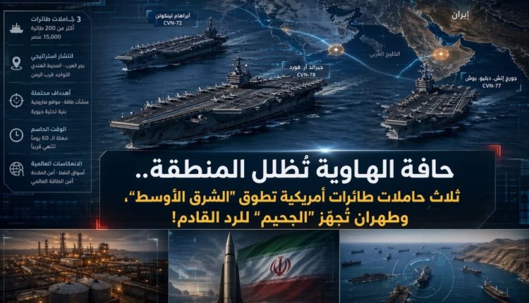 التواجد المتزامن لثلاث حاملات طائرات (أبراهام لينكولن، جيرالد آر. فورد، جورج إتش. دبليو. بوش) في منطقة عمليات القيادة المركزية (CENTCOM) ليس مجرد “حصار روتيني”. هذا تموضع هجومي بامتياز، يضم أكثر من 200 طائرة و15,000 عنصر، ويشير إلى استعداد لعملية عسكرية واسعة: