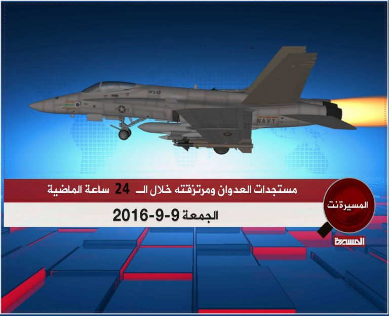 ففي محافظة صعدة شن طيران العدوان غارتين على منطقة وادي الجبل ومنطقة المصاحف ، كما شن 5 غارات على منطقة مندبة في مديرية باقم،