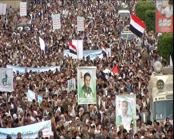 شهدت العاصمة اليمنية صنعاء اليوم الجمعة مسيرة شعبية كُبرى في باب اليمن بمناسبة الذكرى السنوية للشهيد تحت عنوان ” مسيرة الوفاء لدماء الشهداء” .