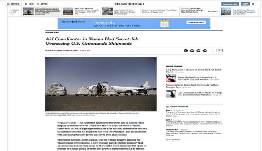 فضيحة هي تلك التي كشفت عنها صحيفة نيويورك تايمز في تقرير لـ آدام غولدمان وإيريك سميت عن ضلوع منسق المعونات الإنسانية في اليمن والمدير القُطري لـ لمجموعة “التنمية عبر المحيطات”، سكوت داردن، بمهام أساسية تجسسية تحت مظلة إنسانية قبل أن تقبض عليه الأجهزة الأمنية اليمنية، بحسب الصحيفة.